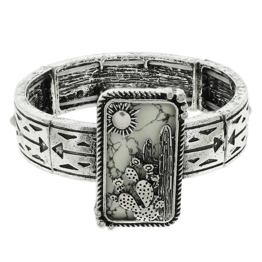 MAGNESITE SET DESERT CACTUS VERTICAL BAR STRETCH BRACELET IN SILVER-TONE OXIDIZED METAL