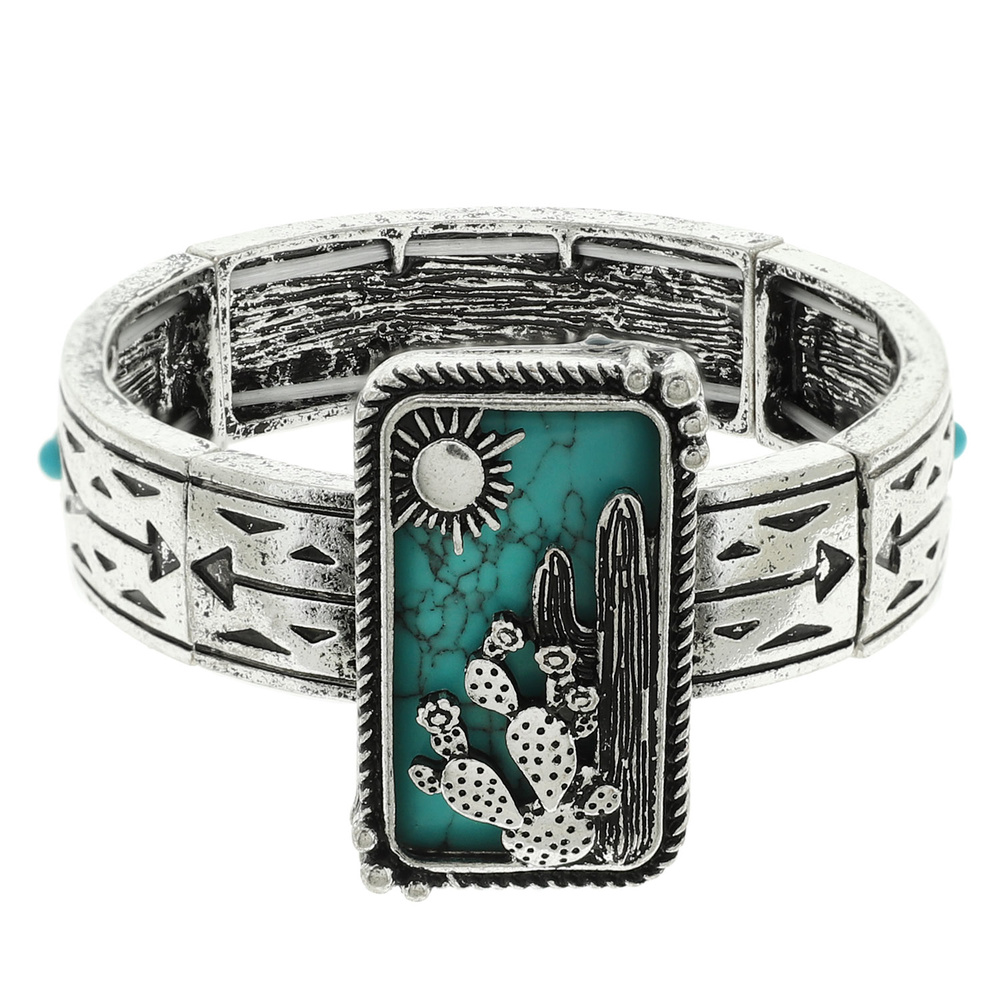 TURQUOISE SET DESERT CACTUS VERTICAL BAR STRETCH BRACELET IN SILVER-TONE OXIDIZED METAL