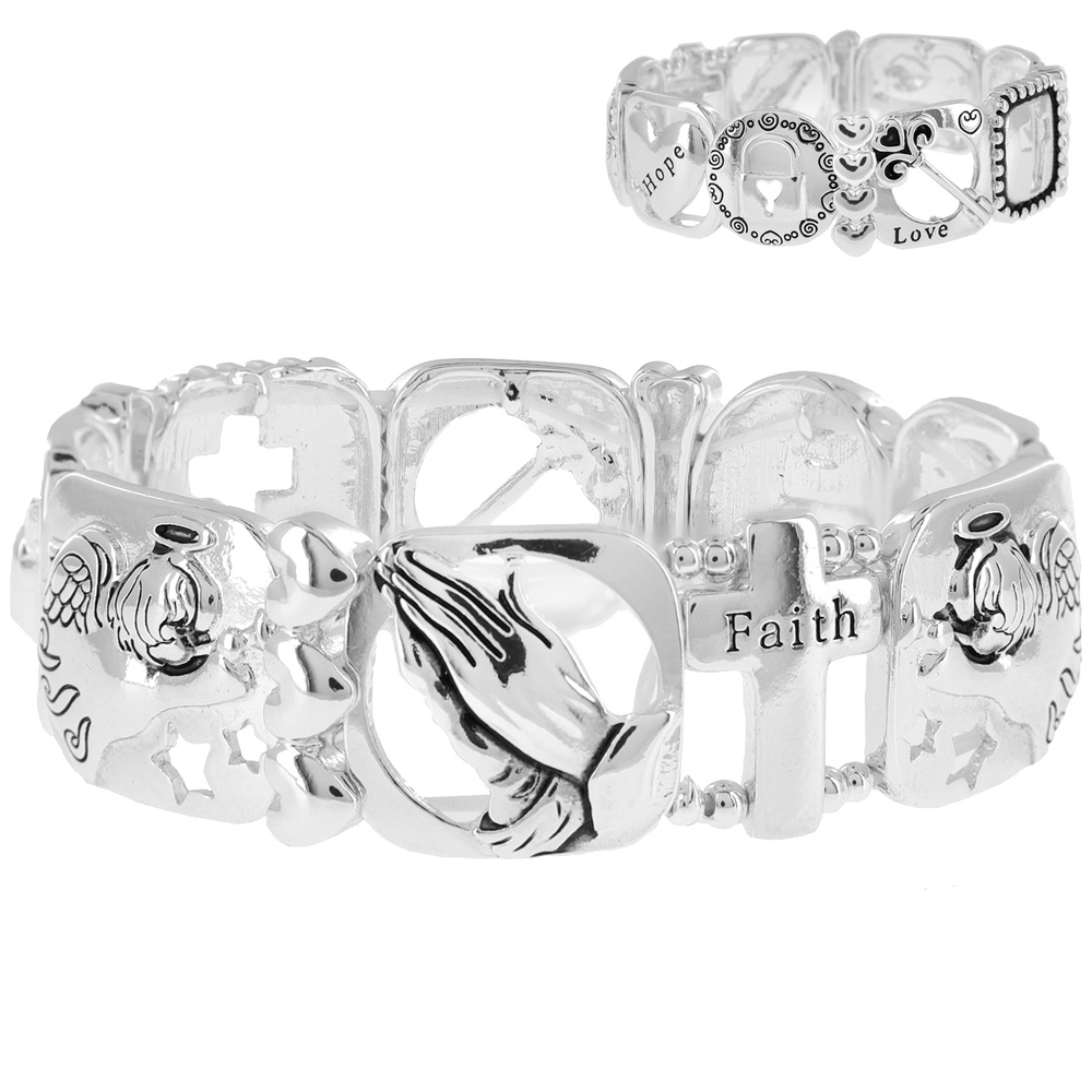 GUARDIAN ANGEL HOPE, LOVE, FAITH CUTOUT STRETCH BRACELET IN SILVER AND MULTITONE METAL