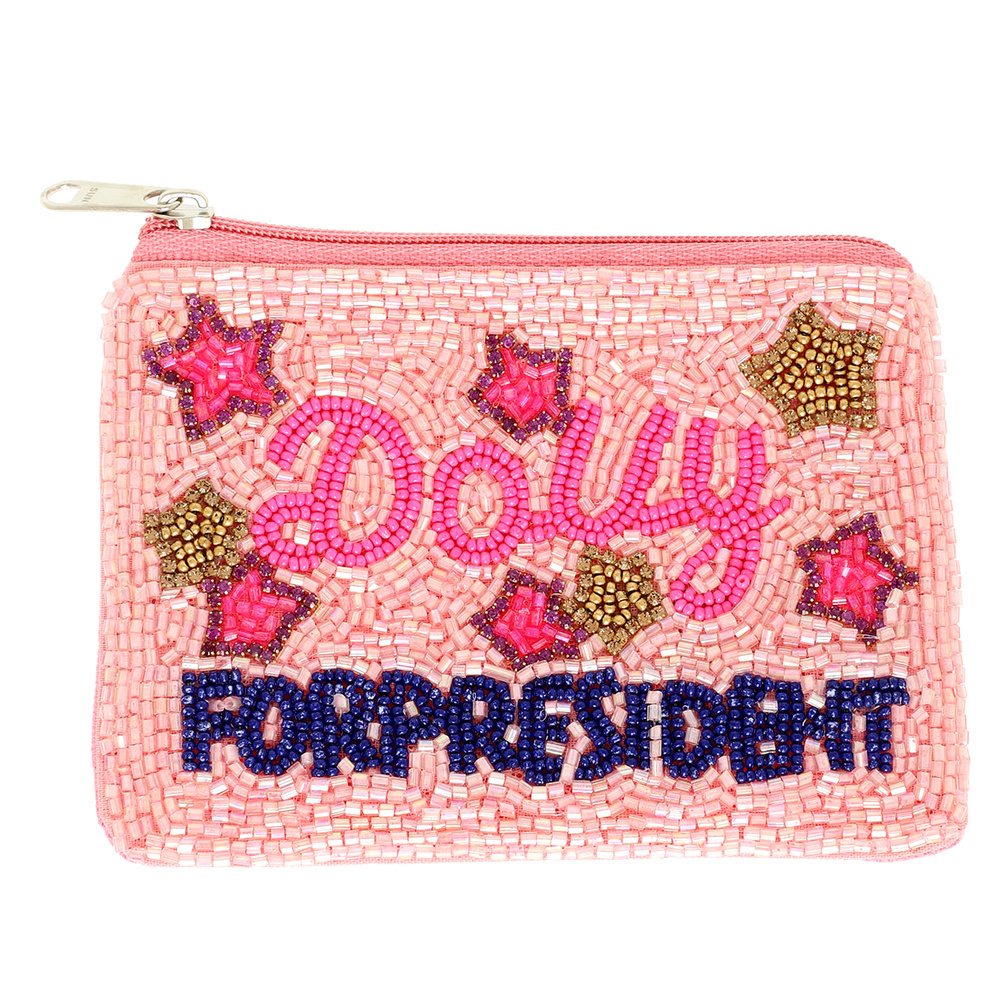 STAR PATTERNED "DOLLY FOR PRESIDENT" SEED BEAD EMBELLISHED COIN BAG