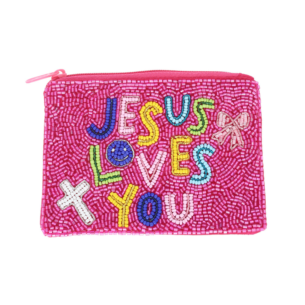 JESUS LOVES YOU SEED BEADED COIN BAG IN HOT PINK