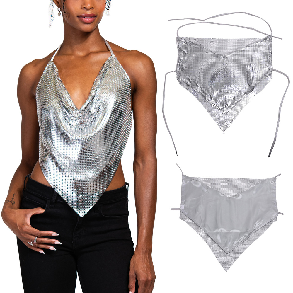 METALLIC SEQUIN BANDANA BACKLESS HALTER TOP