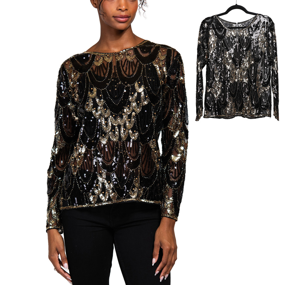 ART DECO SCALLOPED SEQUIN EMBELLISHED SEMI SHEER ROUND NECK LONG SLEEVE EVENING TOP