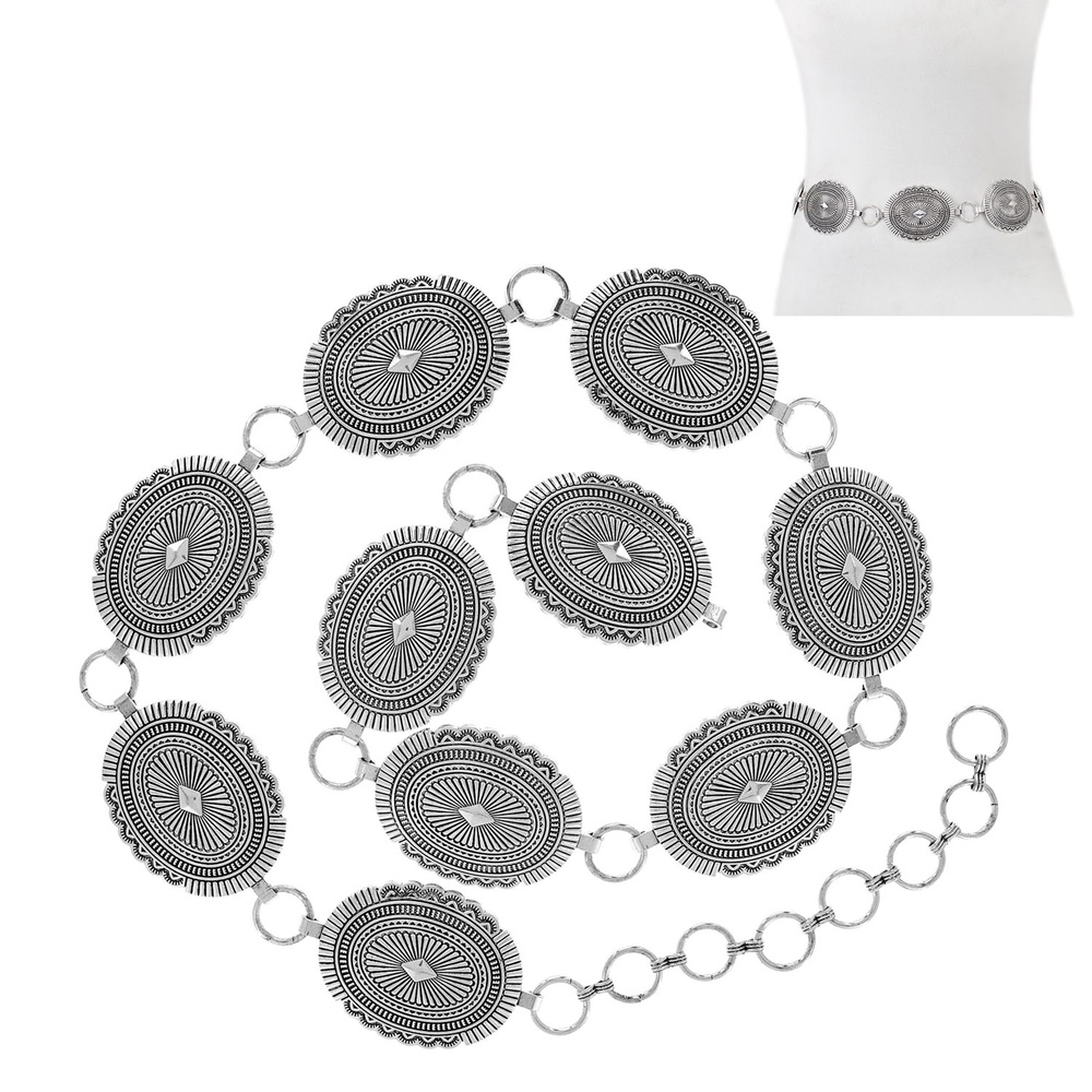 SUNBURST FLOWER OVAL CONCHO METAL CHAIN LINK HIP BELT IN SILVER TONE-WESTERN BELTS