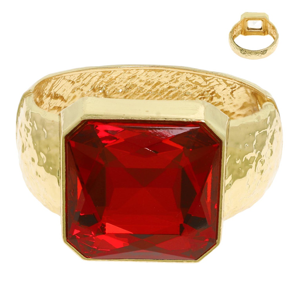 LARGE CENTER STONE CRYSTAL GEMSTONE HAMMERED METAL HINGED BANGLE CUFF BRACELET IN GOLD TONE METAL