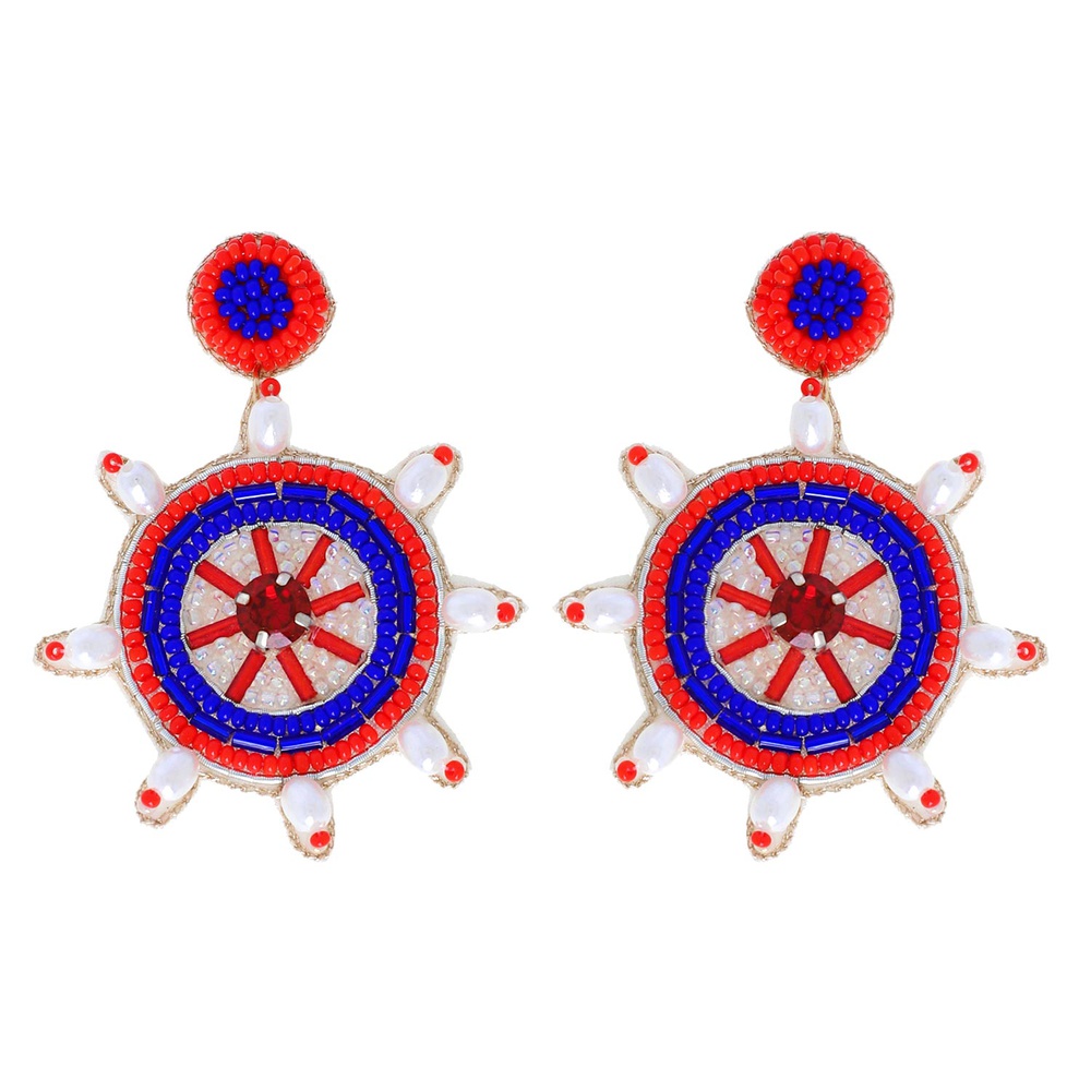 2-tier Jeweled Patriotic Usa Nautical Ship Wheel Beaded Embroidery Dangle And Drop Earrings