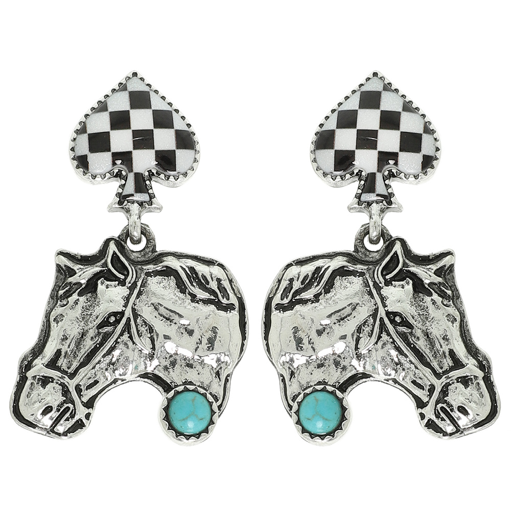 TURQUOISE EMBELLISHED CHECKERED ACE OF SPADES AND HORSE POST DANGLE EARRINGS