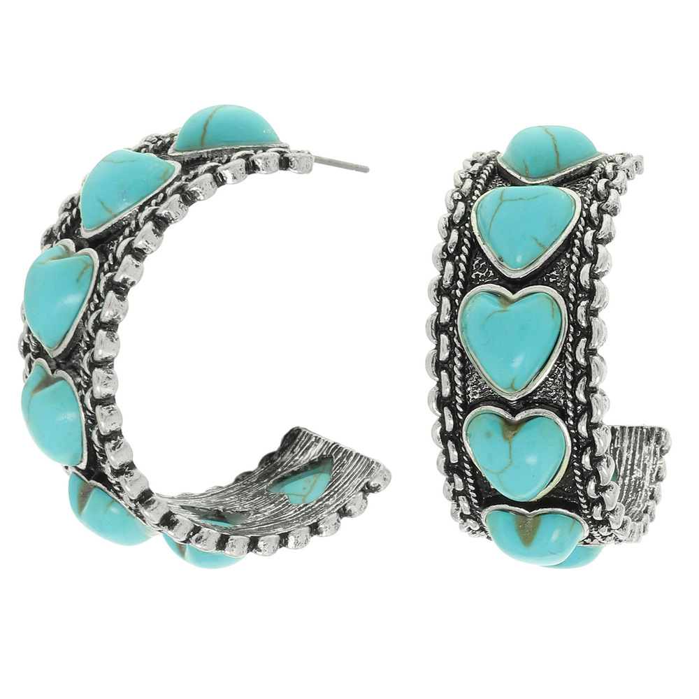 WESTERN HEART STONE OPEN HOOP EARRINGS IN OXIDIZED SILVER TONE METAL