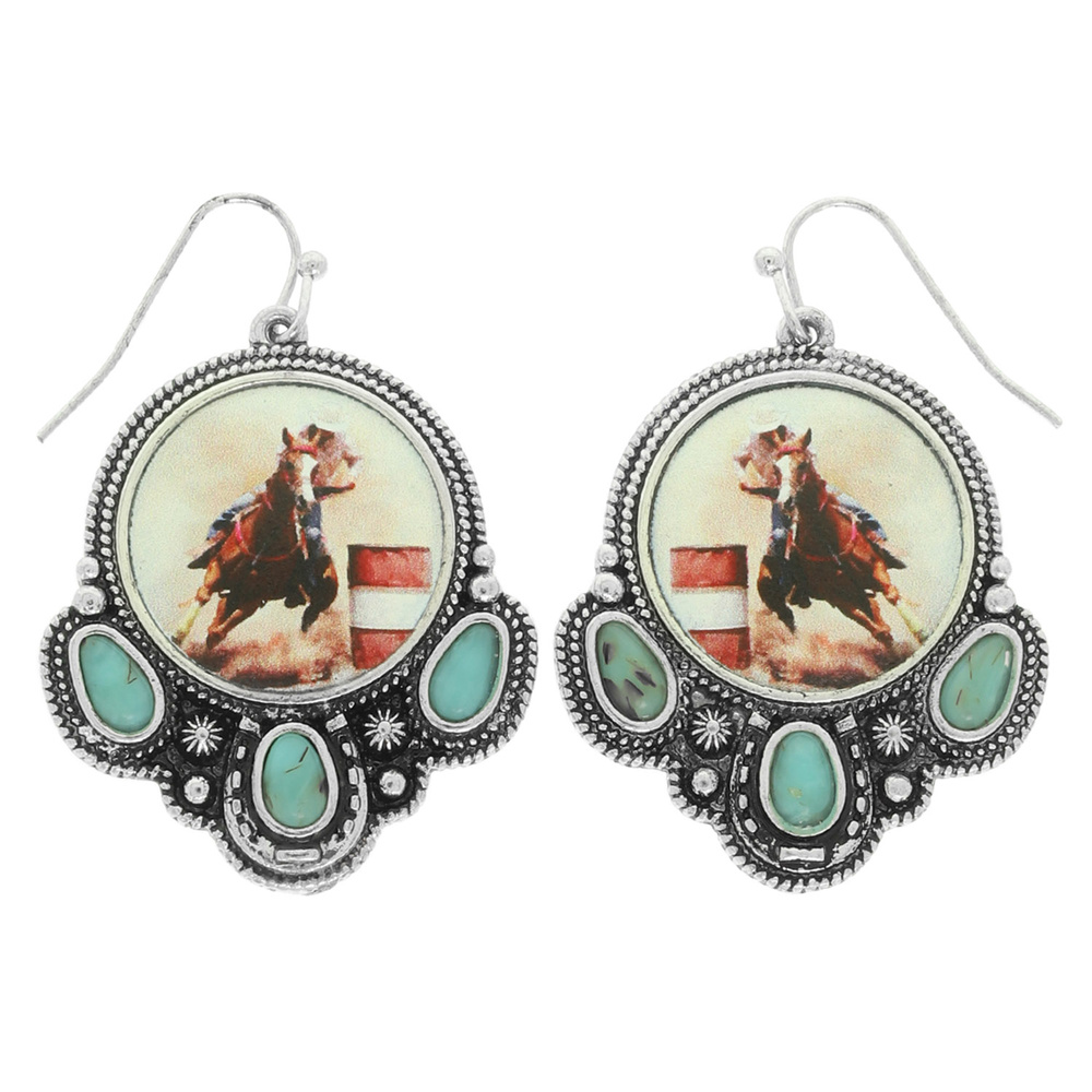 WESTERN DANGLE EARRINGS WITH RODEO BARREL RACER AND TURQUOISE STONE ACCENTS