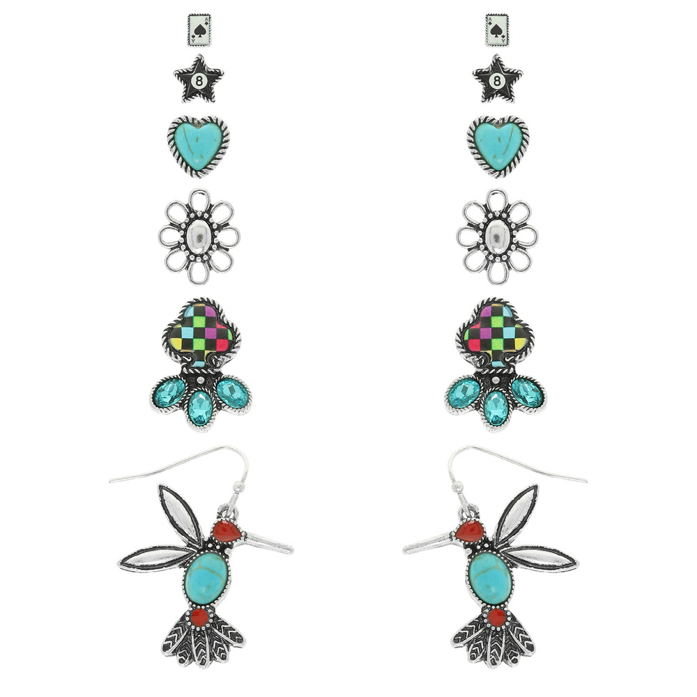 WESTERN ASSORTED EARRING SET WITH HUMMINGBIRD HEART AND CARD DESIGNS