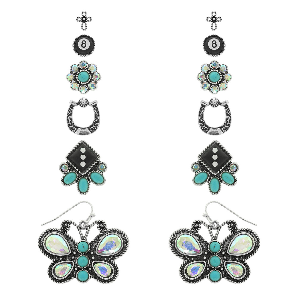 WESTERN EARRING ASSORTED SET WITH BUTTERFLY DICE AND HORSESHOE STYLE DESIGNS