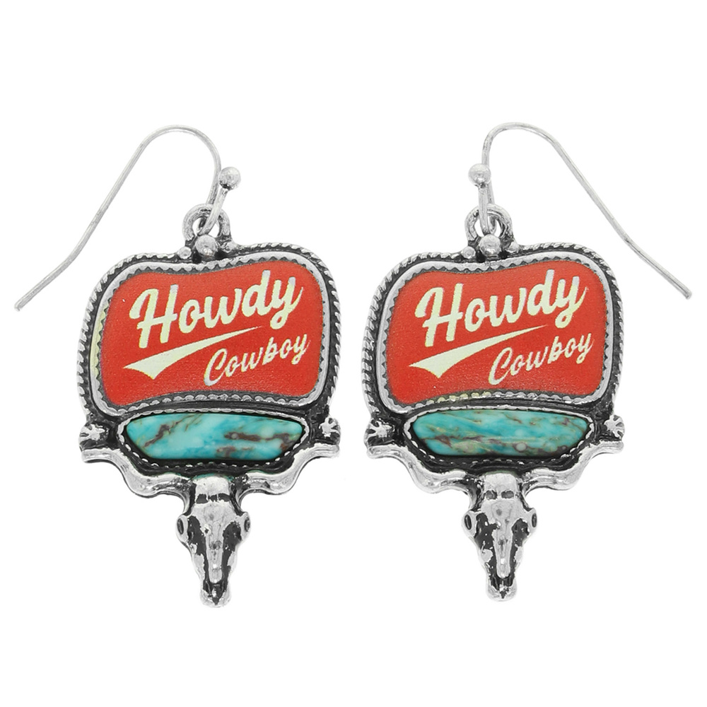 WESTERN HOWDY COWBOY EARRINGS WITH BULL SKULL AND TURQUOISE ACCENT