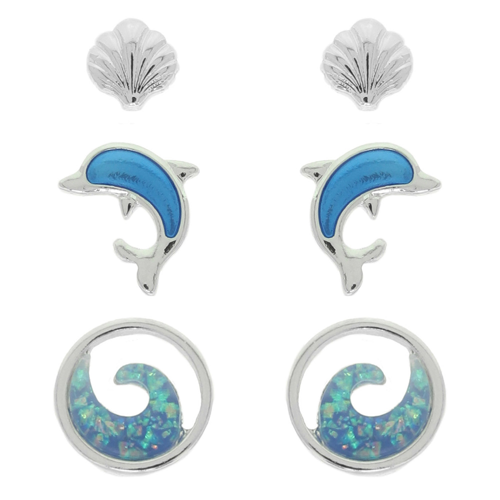 SHELL DOLPHIN AND WAVE DESIGNS WITH EPOXY OPAL STONE STUD EARRING SET