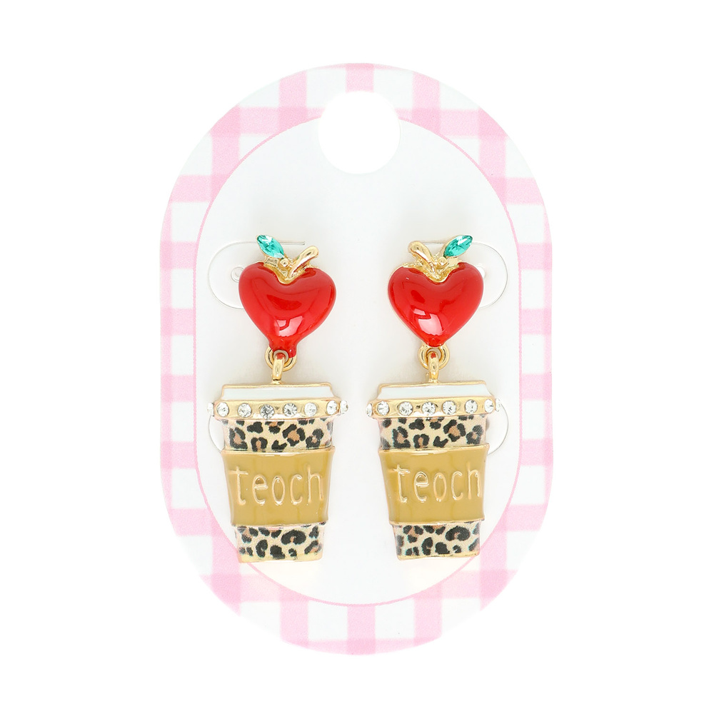 TEACHER COFFEE CUP DANGLE EARRINGS WITH HEART APPLE STUDS