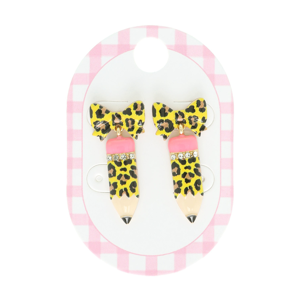 TEACHER LEOPARD PENCIL DANGLE EARRINGS WITH BOW STUDS