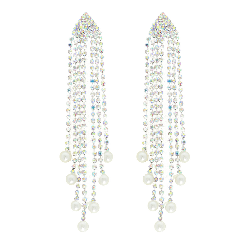 TRIANGLE CRYSTAL RHINESTONE SIMULATED PEARL TASSEL LONG DROP EARRINGS