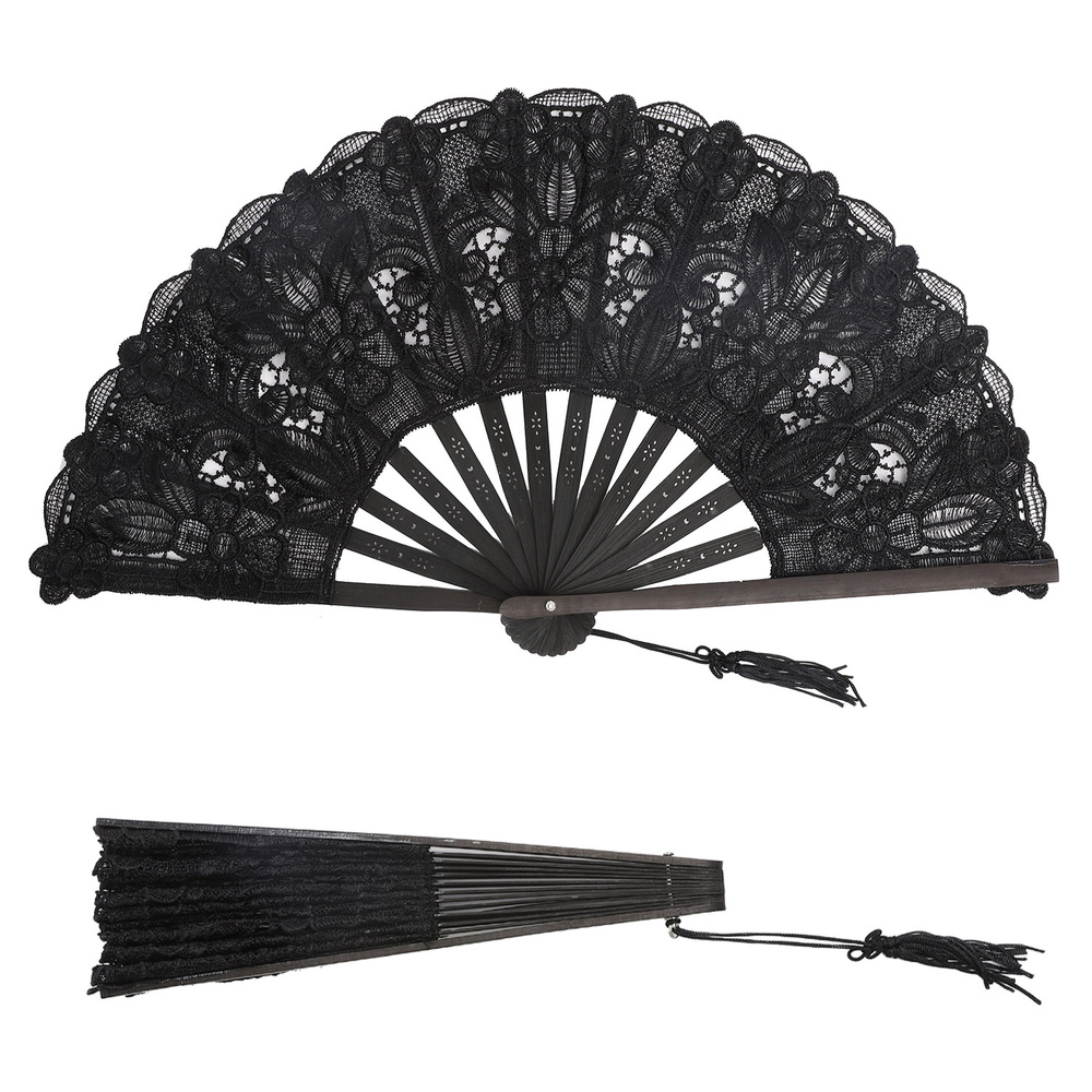 SPANISH VICTORIAN BLACK CHANTILLY LACE FAN WITH MINIATURE TASSEL
