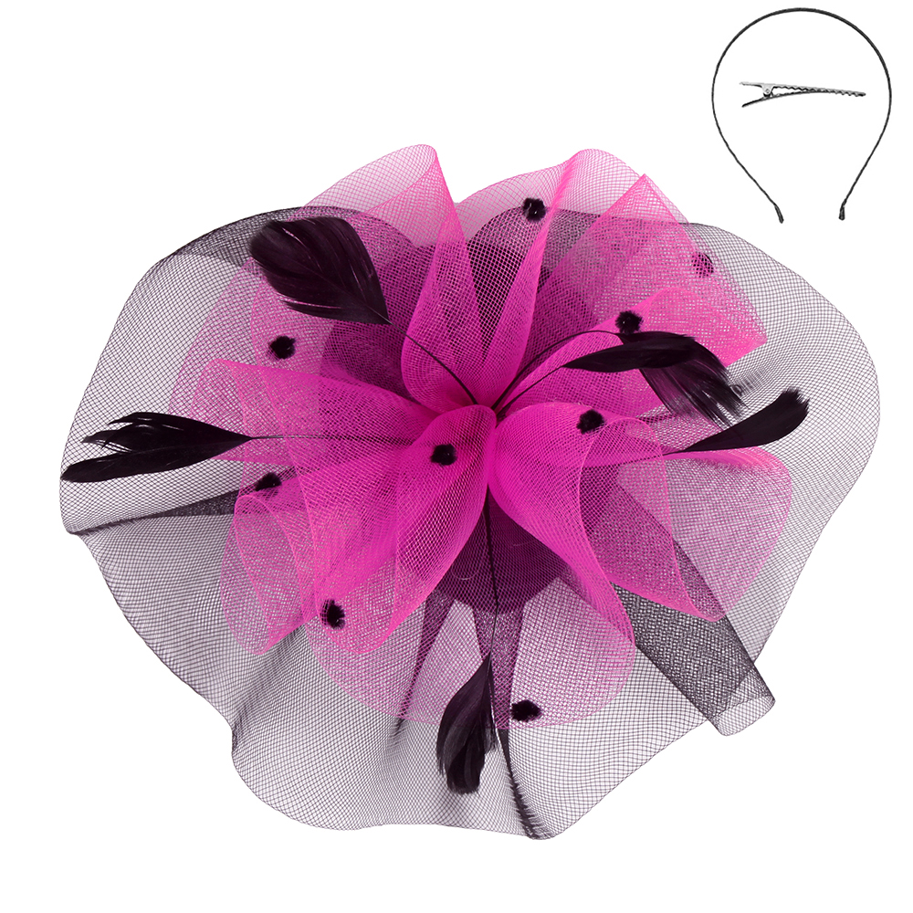 2 Tone Ruffle Mesh With Dots And Feathers Hair Clip And Headband Dual Function Fascinator