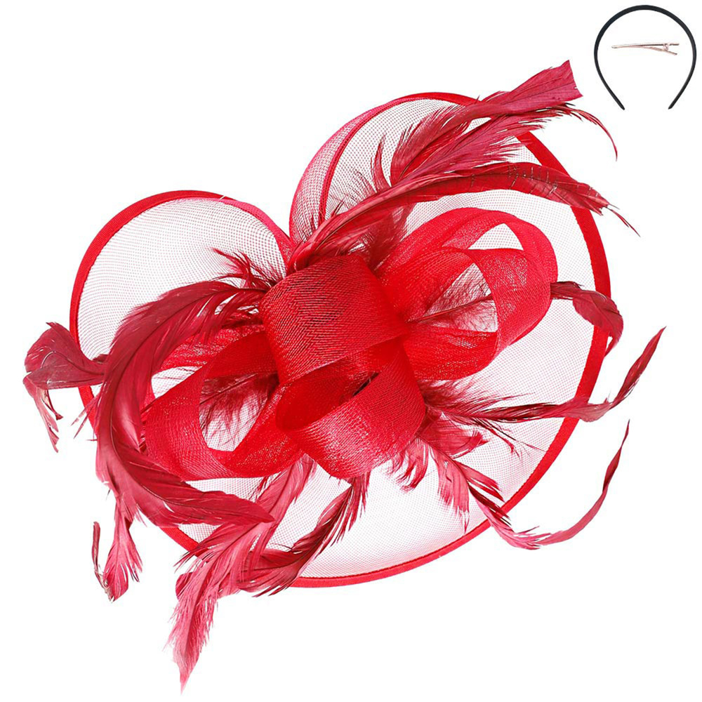 3-PIECE KENTUCKY DERBY SOUTHERN STYLE LARGE RIBBON FEATHERED MESH DECORATIVE HEADPIECE FASCINATOR WITH SATIN TRIM *** DETACHABLE HEADBAND, INCLUDES HEADBAND AND CLIP ***