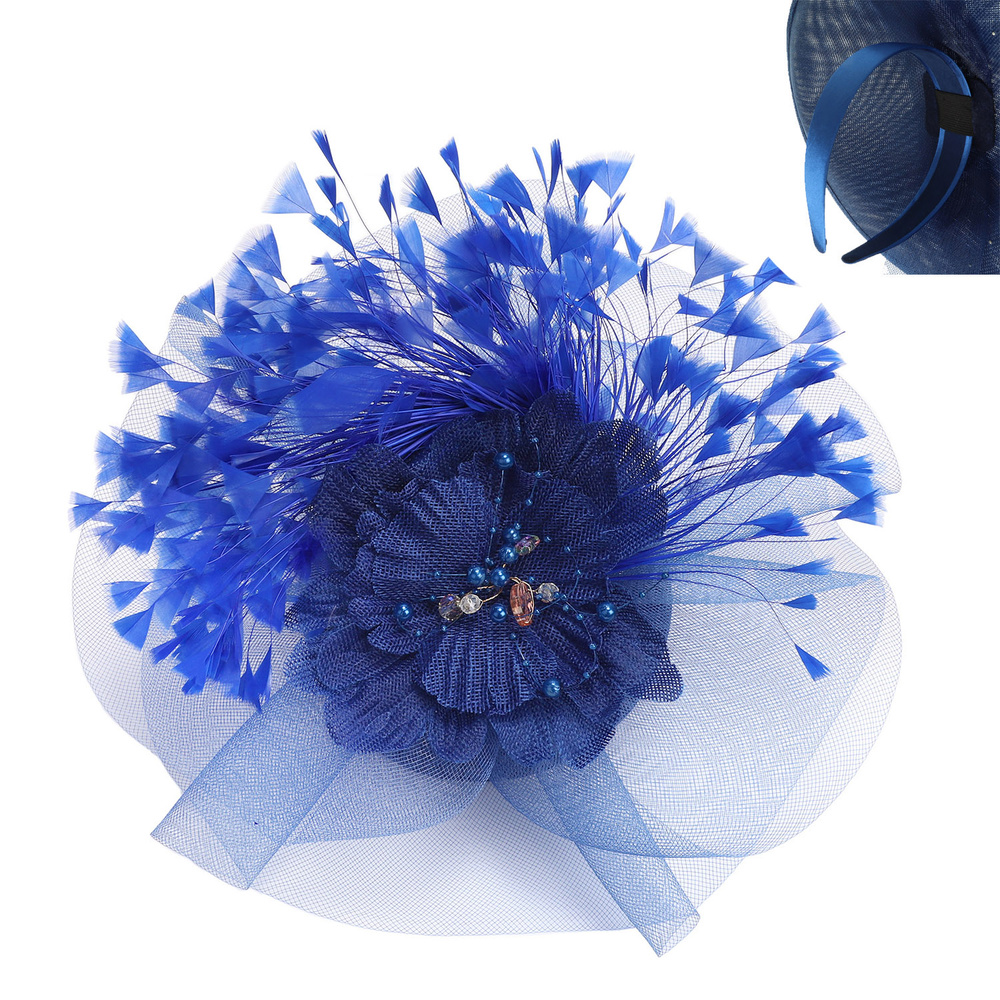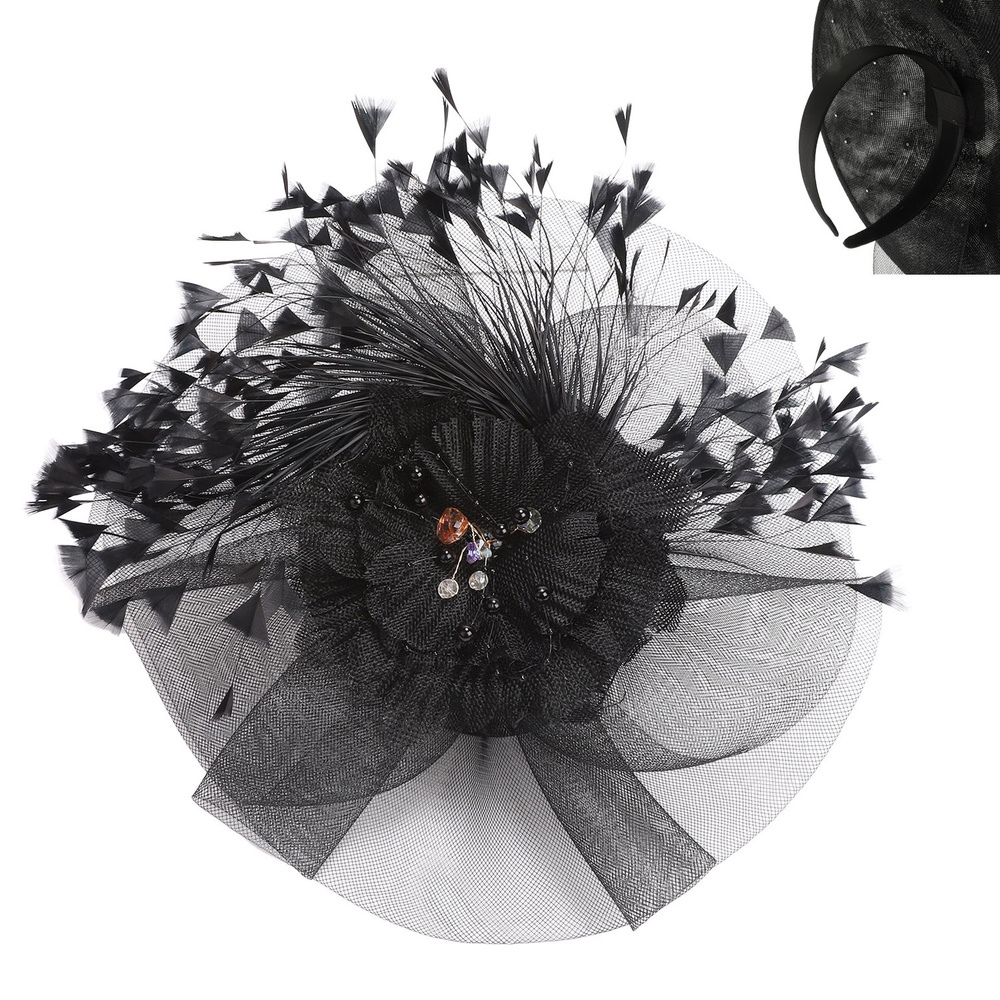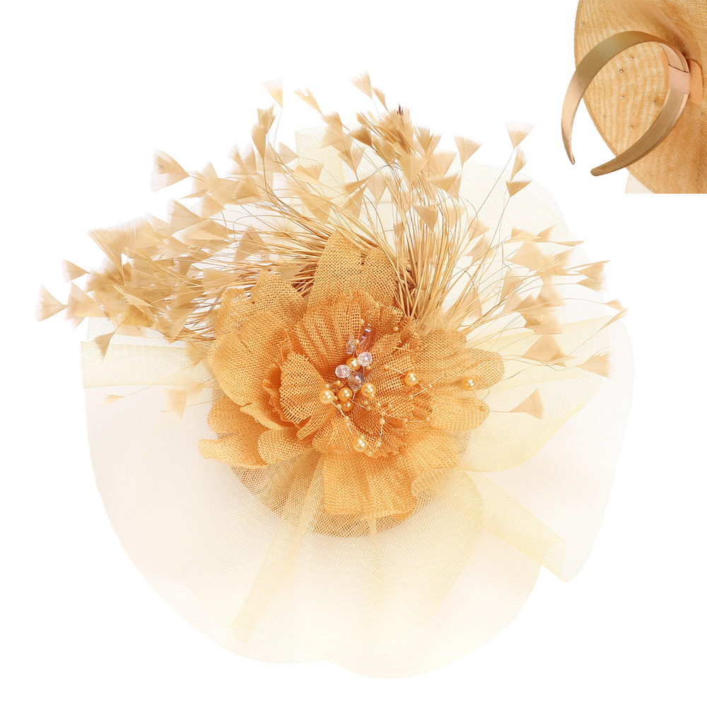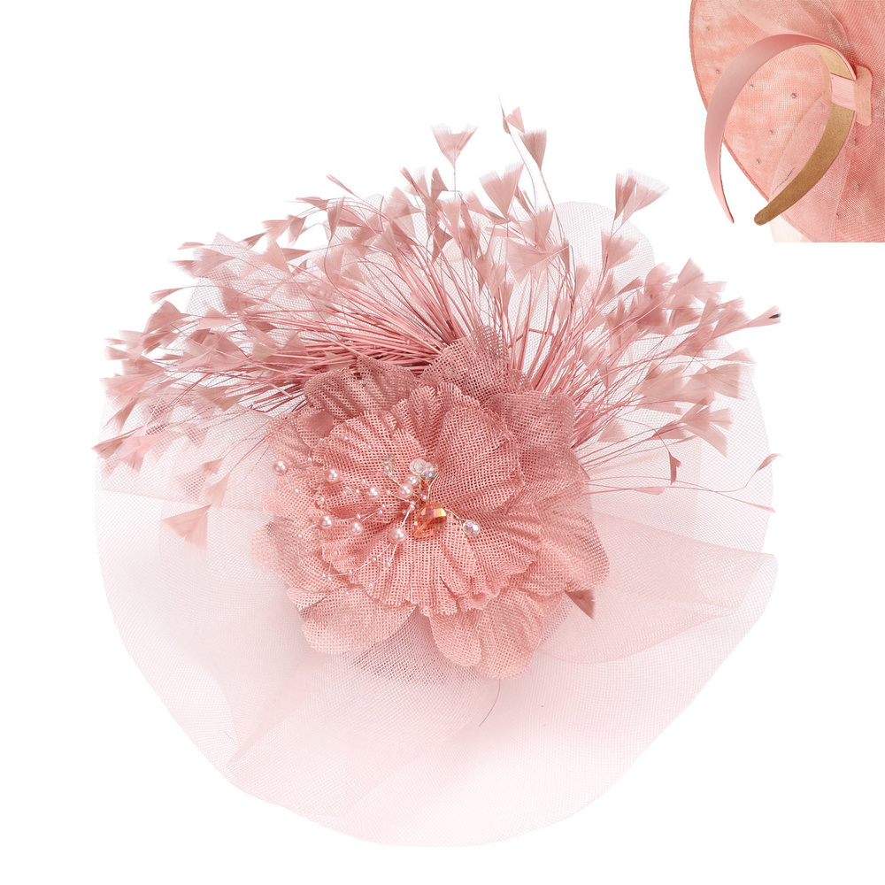 TULLE FLOWER FEATHER SPRAY DISC FASCINATOR WITH PEARL AND CRYSTAL ACCENTS