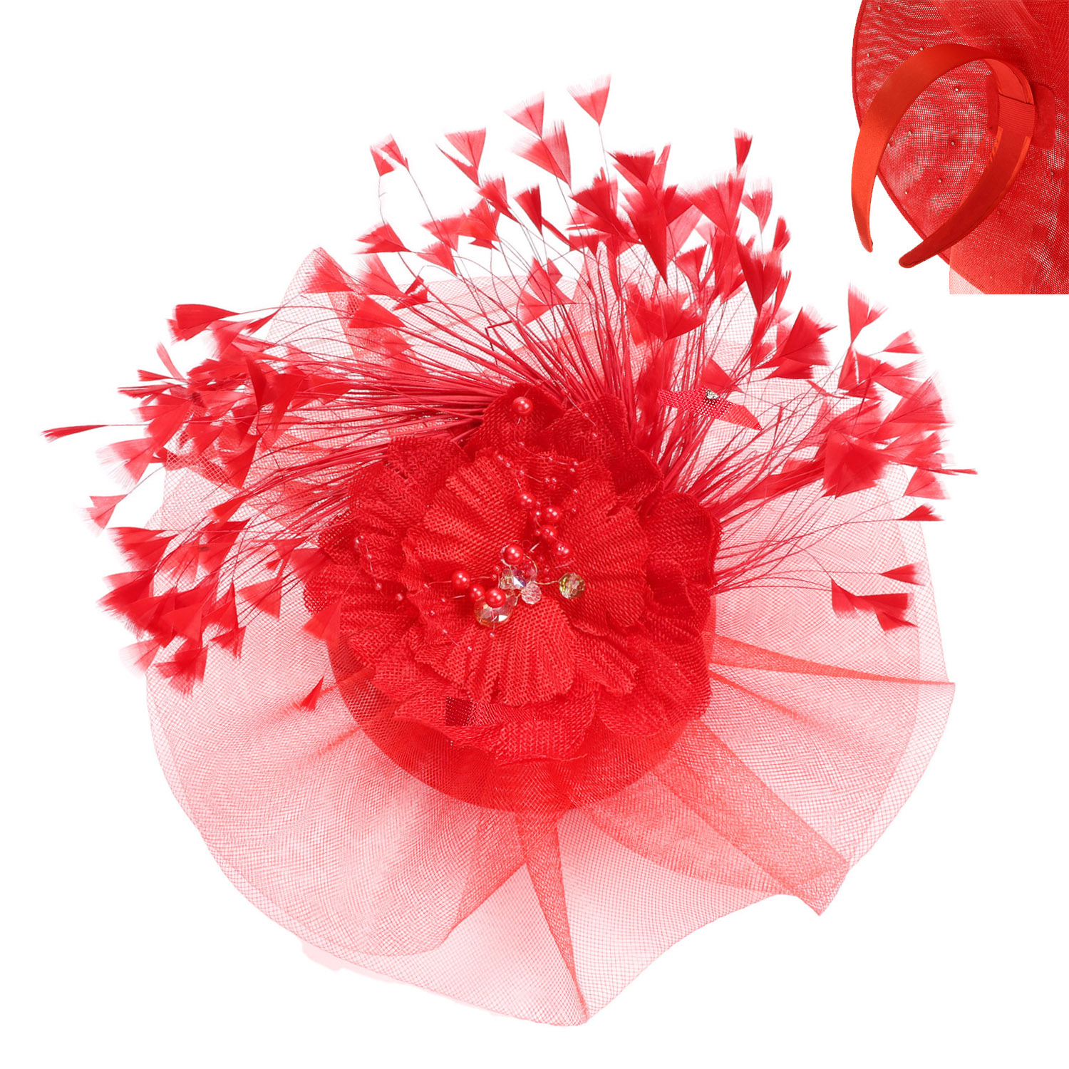 TULLE FLOWER FEATHER SPRAY DISC FASCINATOR WITH PEARL AND CRYSTAL ACCENTS