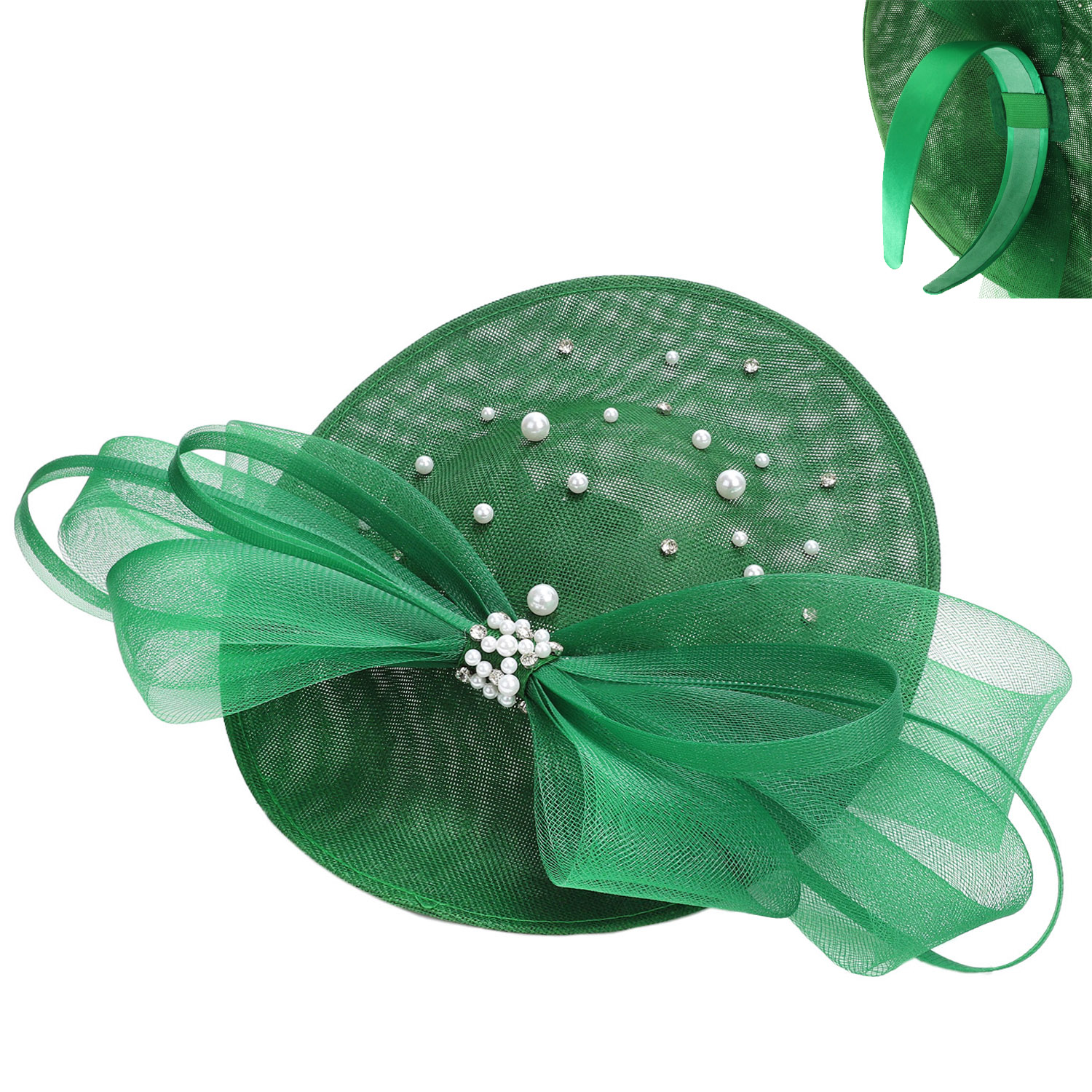 ORGANZA BOW SAUCER FASCINATOR WITH PEARL AND RHINESTONE ACCENT