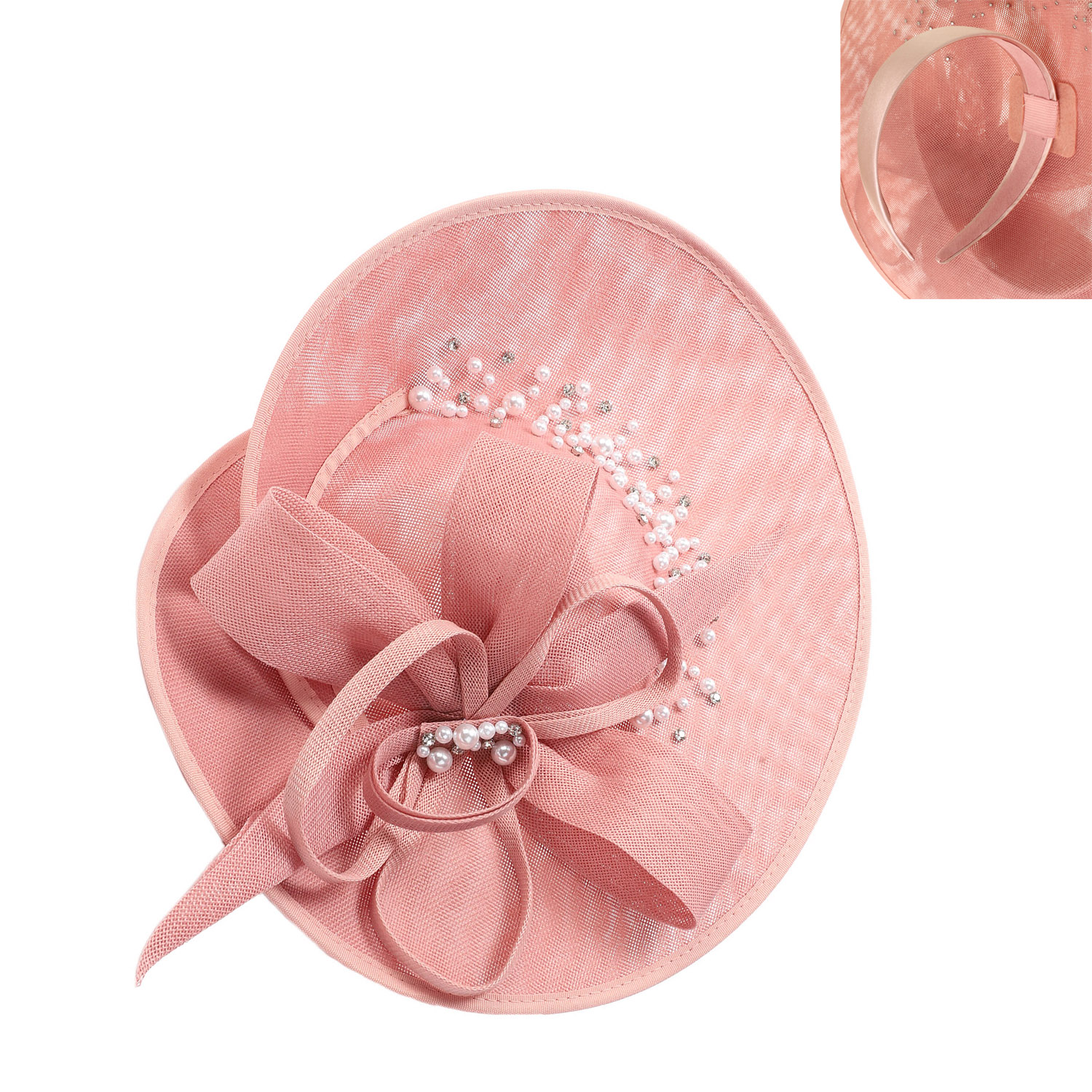 SAUCER FASCINATOR WITH LOOPED BOW AND PEARL RHINESTONE SPRAY