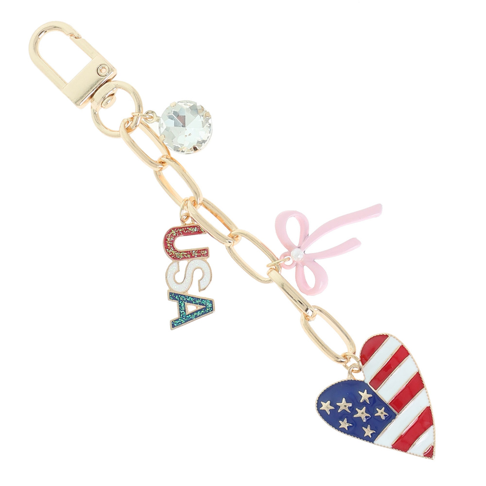 PATRIOTIC USA FLAG HEART KEYCHAIN WITH PINK BOW AND CRYSTAL CHARM