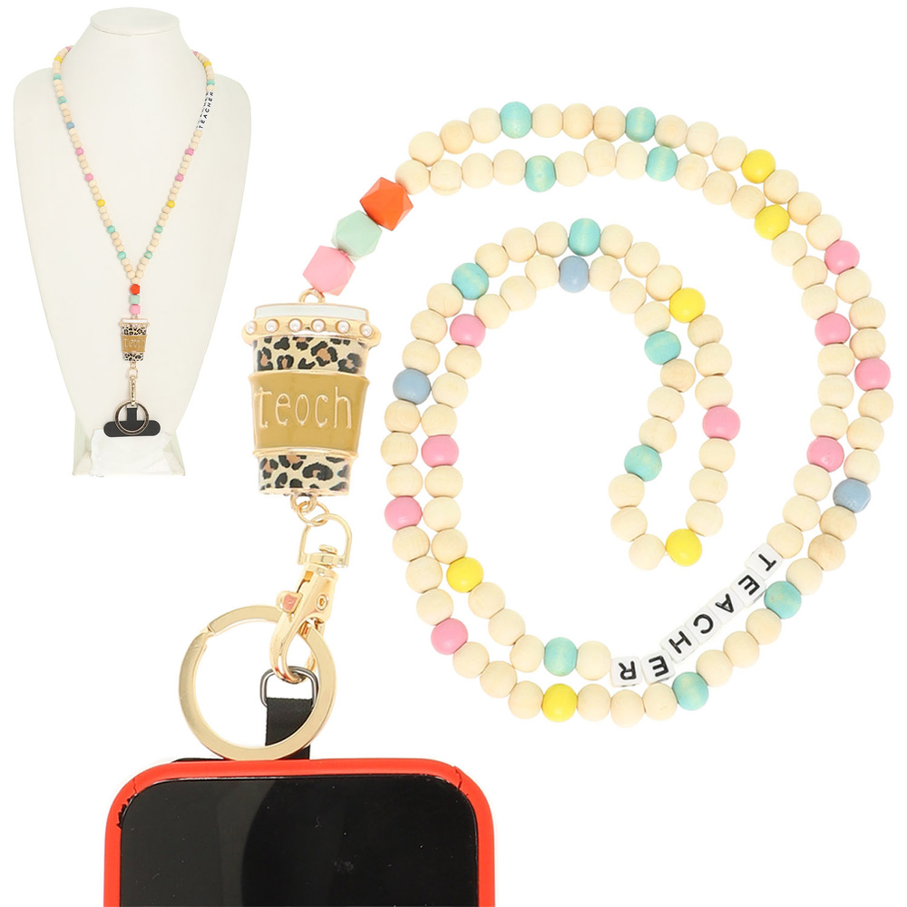 LEOPARD COFFEE CUP TEACHER BEADED LANYARD WITH MULTICOLOR WOOD BEADS