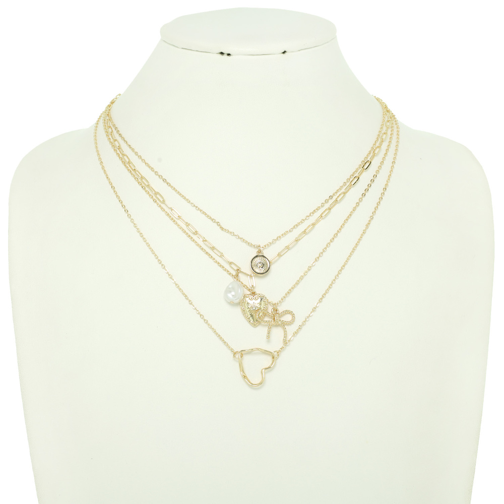 MULTI-STRAND HEARTS PEARL BOWKNOT DISC PENDANT CHAIN NECKLACE