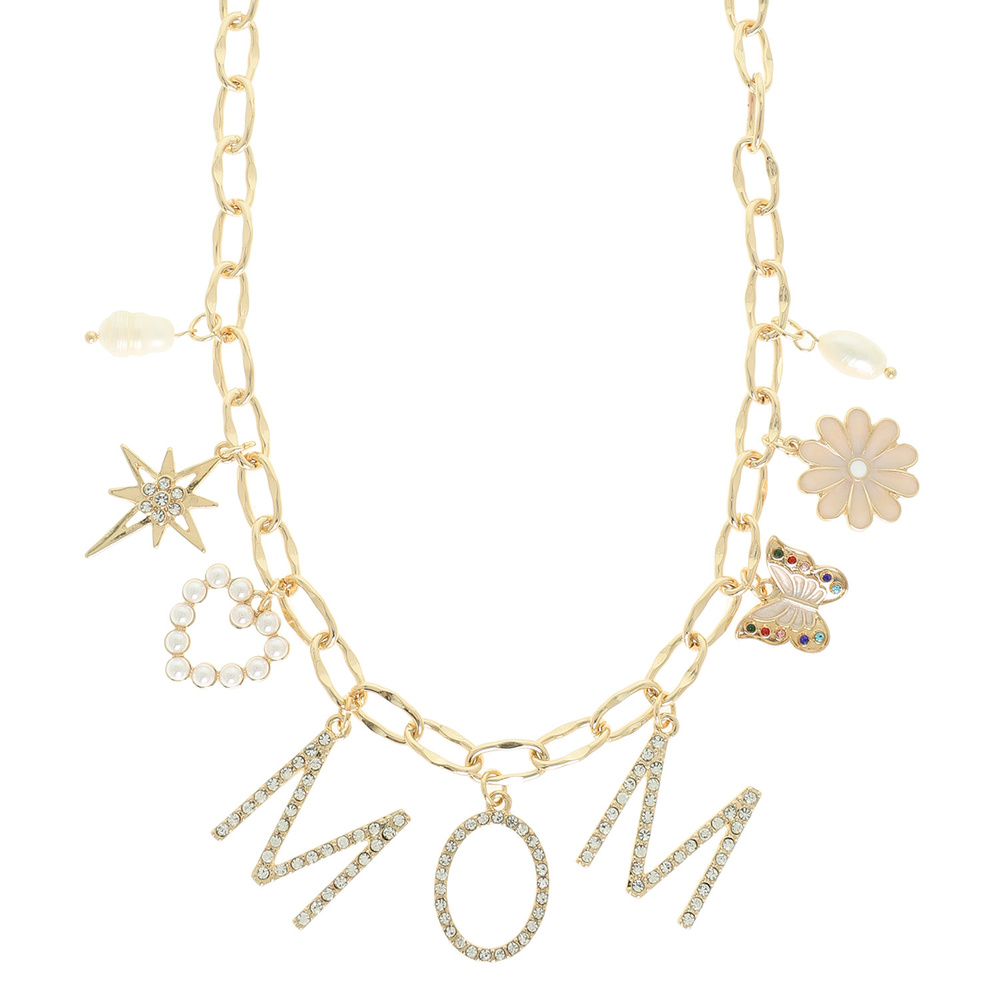 "MOM" SPRING THEME PEARL RHINESTONE EMBELLISHED MULTI-CHARM NECKLACE
