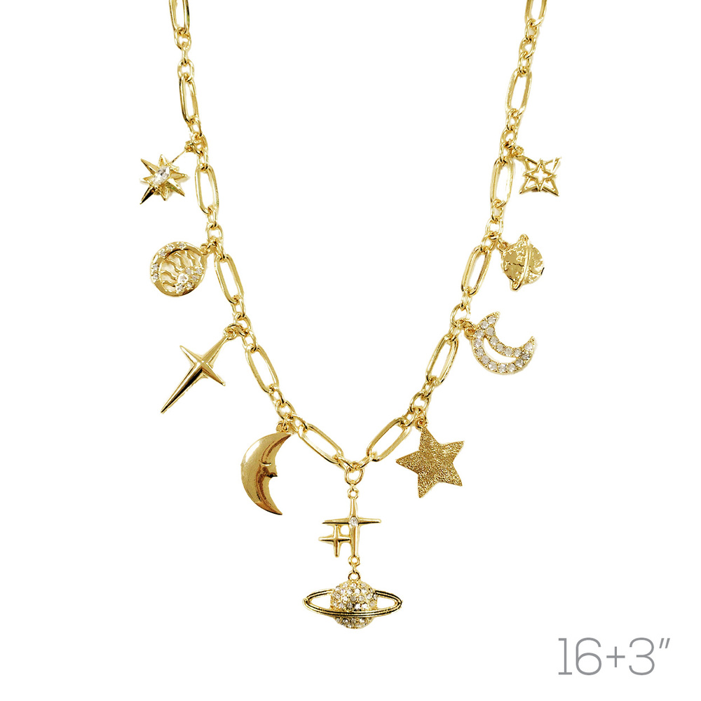 RHINESTONE EMBELLISHED CELESTIAL THEME MULTI CHARM CHAIN NECKLACE