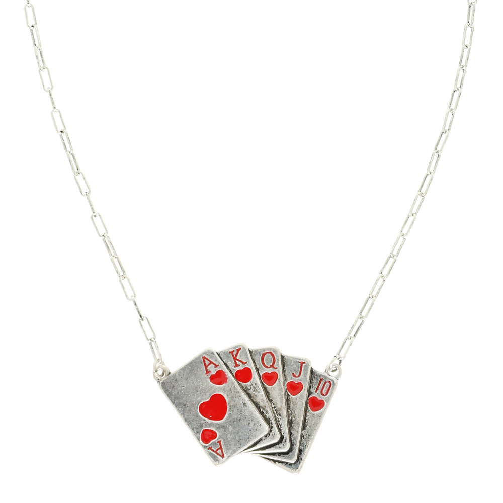 WESTERN ACE OF HEARTS ROYAL FLUSH PENDANT NECKLACE IN OXIDIZED SILVER-TONE METAL