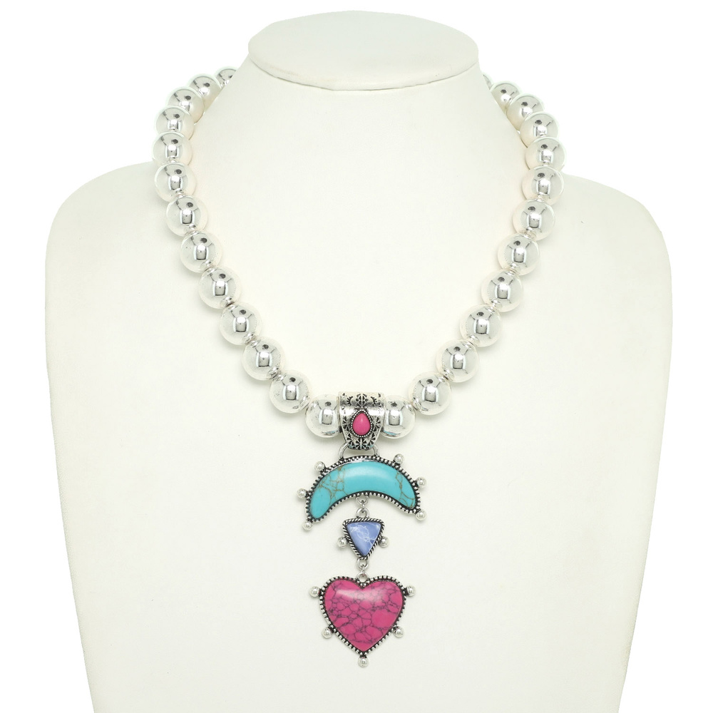WESTERN MULTICOLOR TURQUOISE EMBELLISHED CRESCENT MOON AND HEART PENDANT NECKLACE