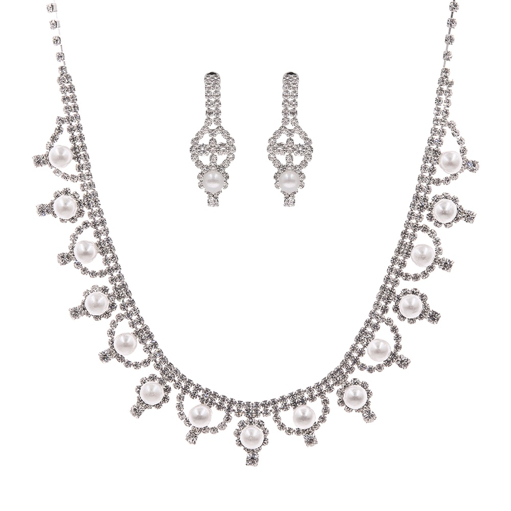 Crystal Rhinestone With Pearl Bridal Wedding Necklace And Earrings Set