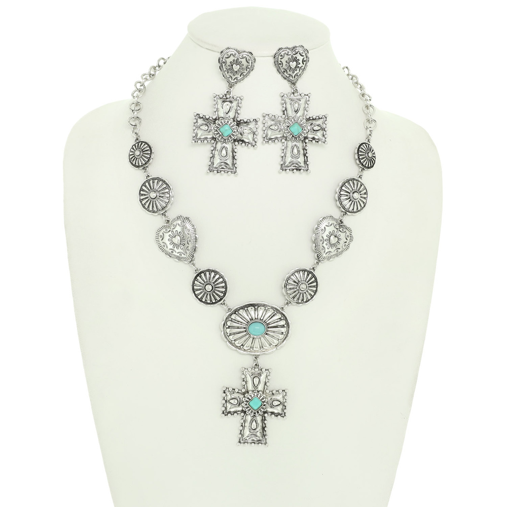 WESTERN TURQUOISE CONCHO CROSS AND HEART NECKLACE EARRING SET