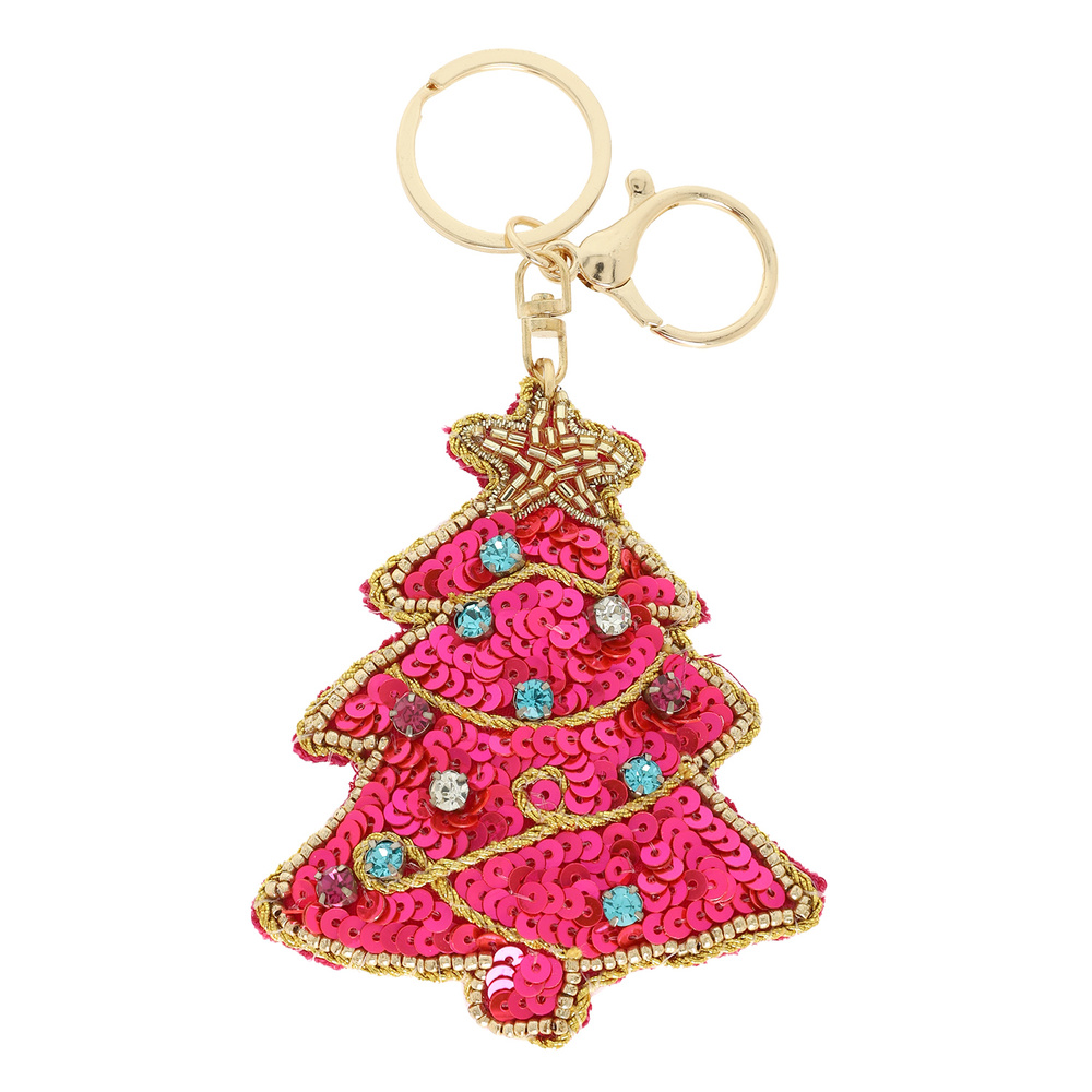 CHRISTMAS TREE SEQUINS CRYSTAL EMBELLISHED KEYCHAIN WITH SPLIT RING AND LOBSTER CLAW CLASP