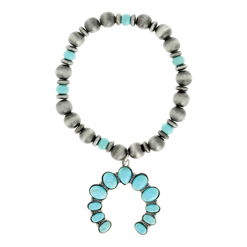WESTERN SQUASH BLOSSOM WITH SYNTHETIC TURQUOISE STONE NAVAJO PEARL STRETCH BRACELET