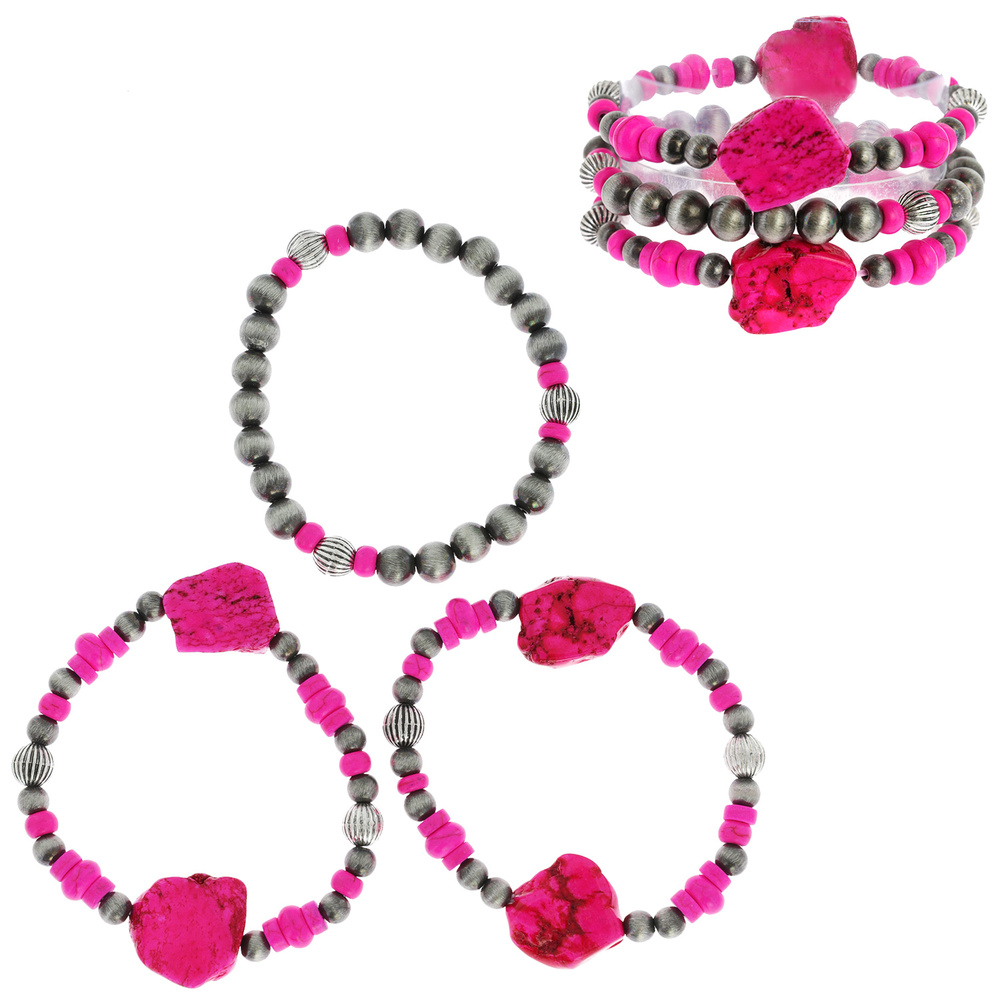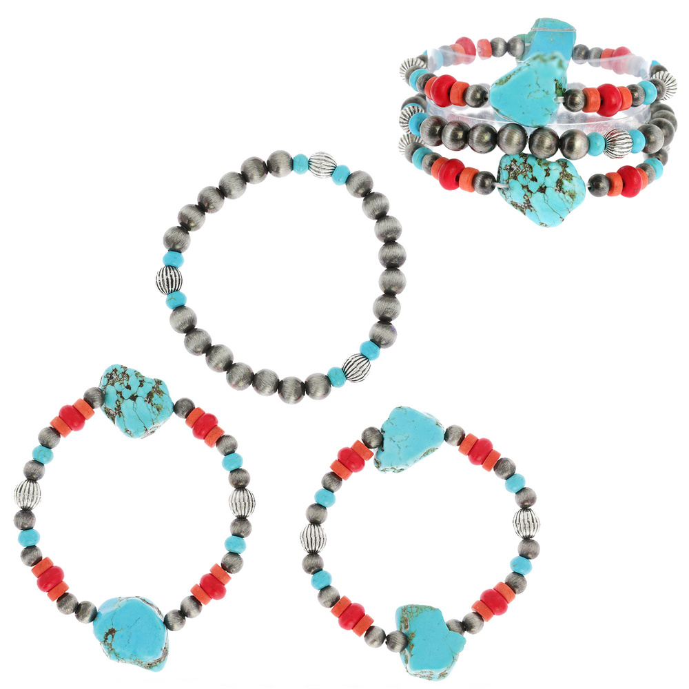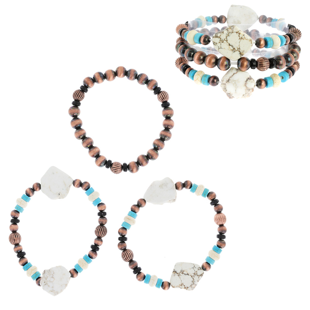 3-PIECE WESTERN NAVAJO PEARL TURQUOISE SLAB BEADED LAYERING STRETCH BRACELET SET