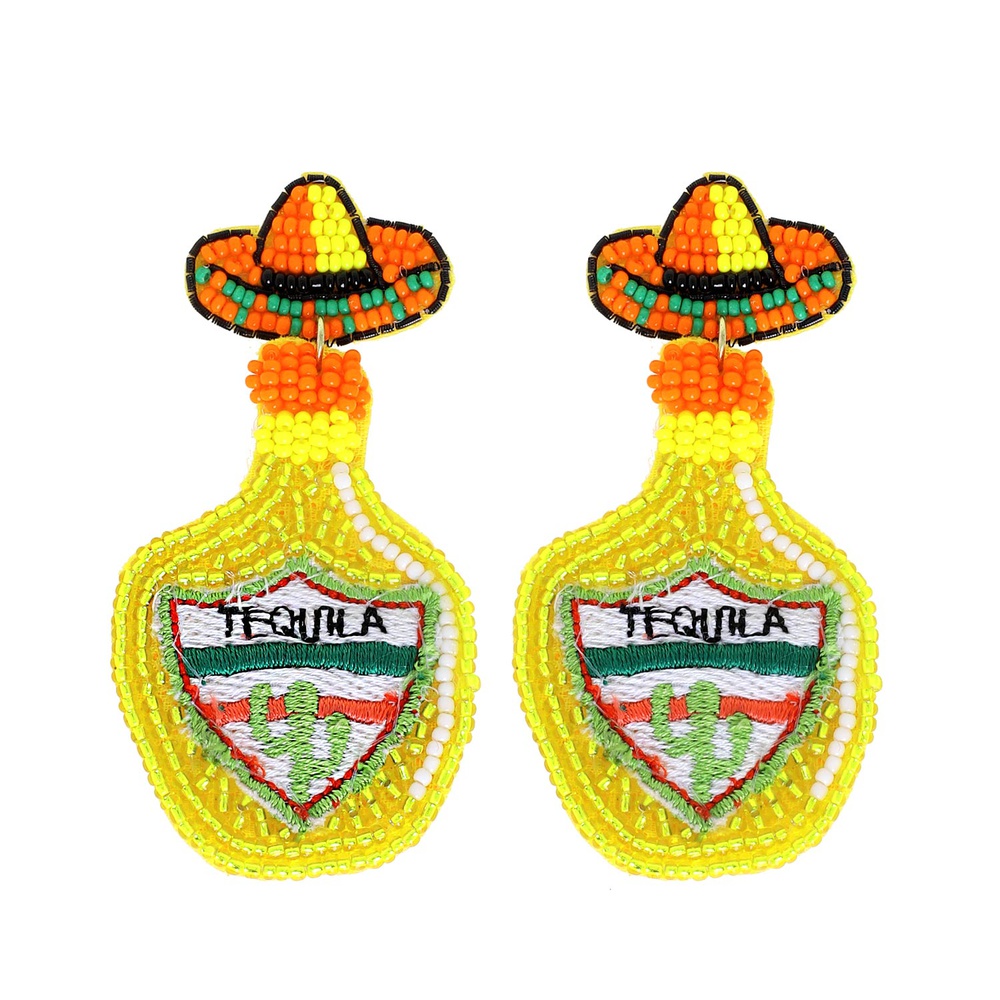 2-tier Sombrero Post Cactus Tequila Bottle Beaded Embroidery Long Drop Earrings