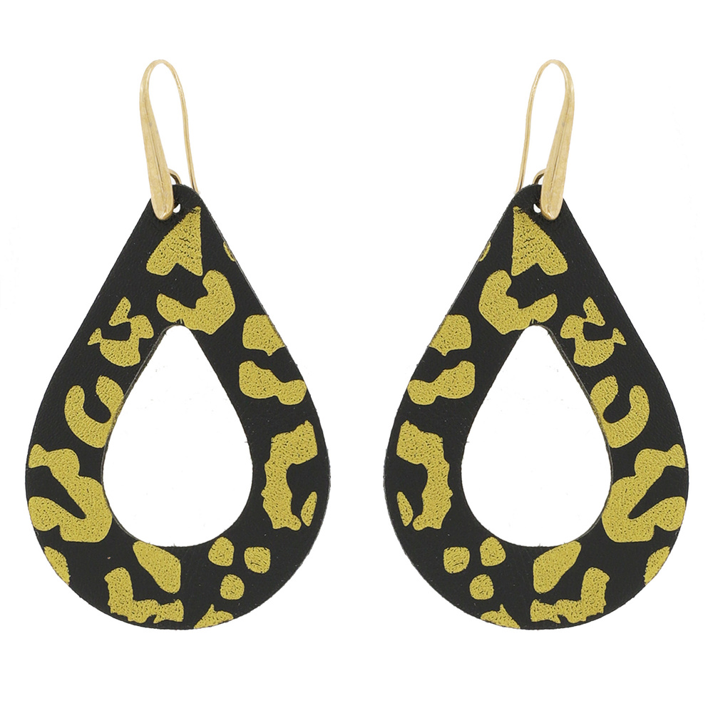 BOHO VEGAN FAUX LEATHER GOLD LEOPARD ANIMAL PRINT OPEN TEARDROP DANGLE AND DROP EARRINGS