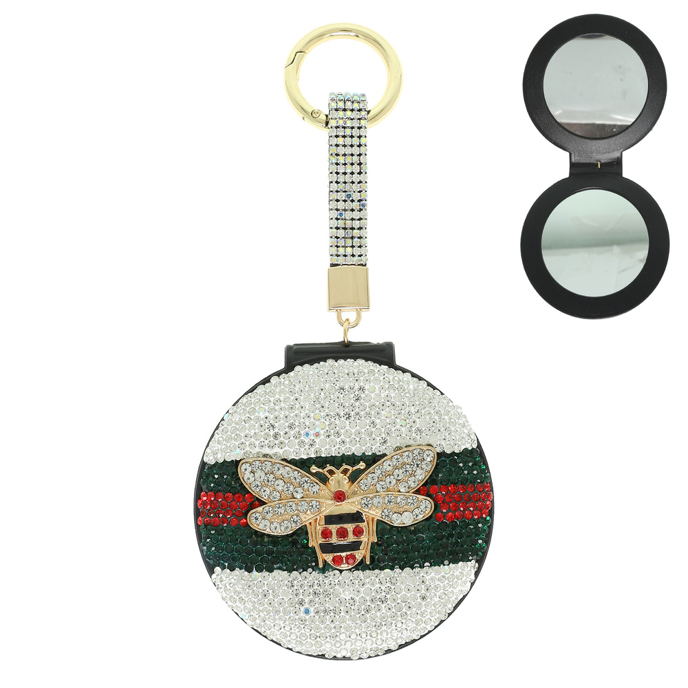 QUEEN BEE CRYSTAL RHINESTONE JEWELED DOUBLE-SIDED COMPACT POCKET MIRROR WITH KEYRING