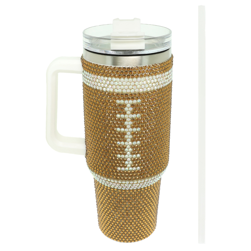 FOOTBALL RHIINESTONE ENCRUSTED STAINLESS STEEL DOUBLE WALL TUMBLER WITH HANDLE, STRAW AND VACUUM LID