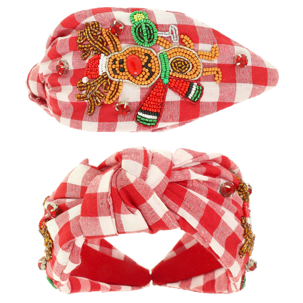 CHRISTMAS REINDEER SEED BEADED TOP KNOTTED HEADBAND WITH CRYSTAL PEARL ACCENTS