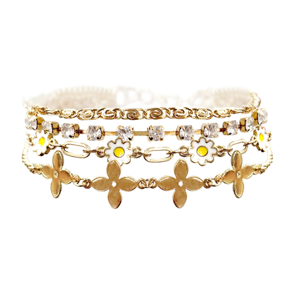 MULTI-LINE DAISY THEME CRYSTAL CHAIN BRACELET IN GOLD-TONE METAL