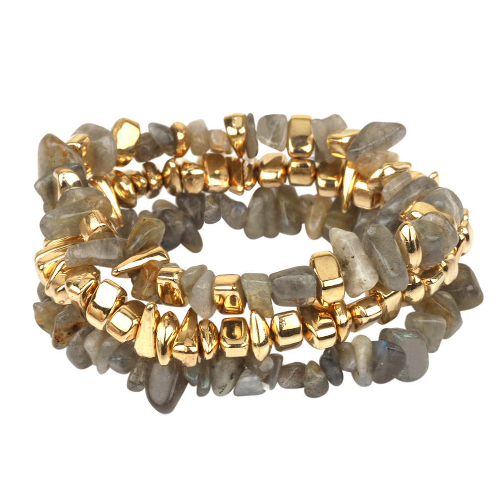 STRETCH BRACELET SET WITH FREEFORM STONE BEADS AND GOLD TONE METAL ACCENTS