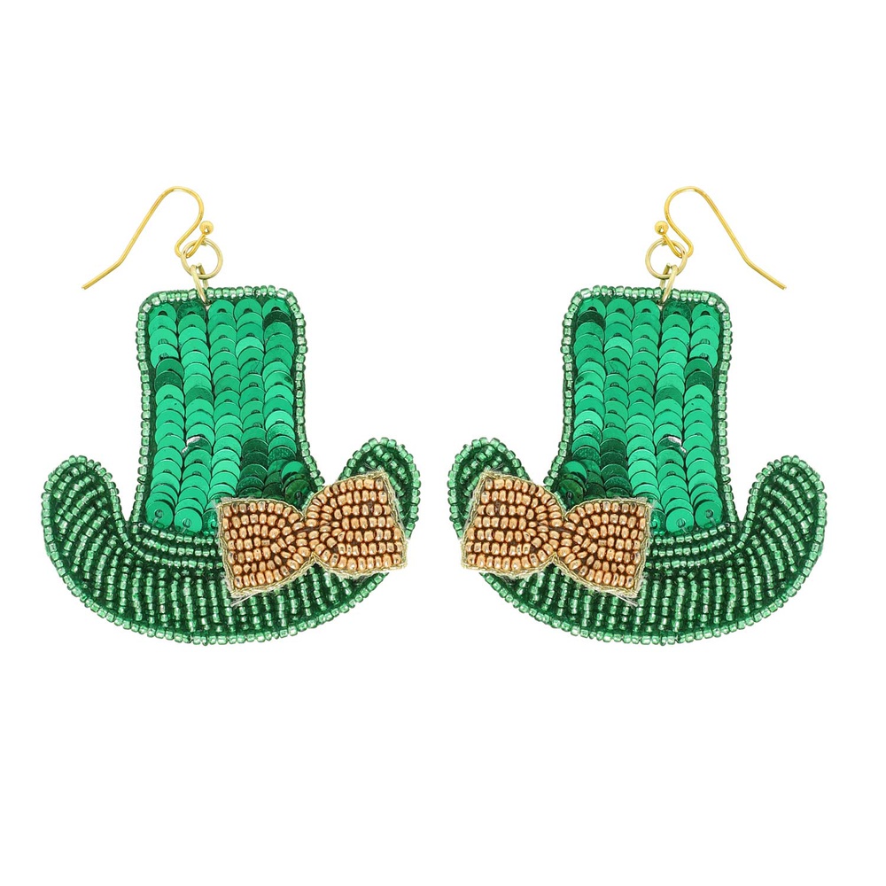 SAINT PATRICK'S DAY LEPRECHAUN HAT BEADED SEQUIN EMBROIDERY HANDMADE DROP EARRINGS