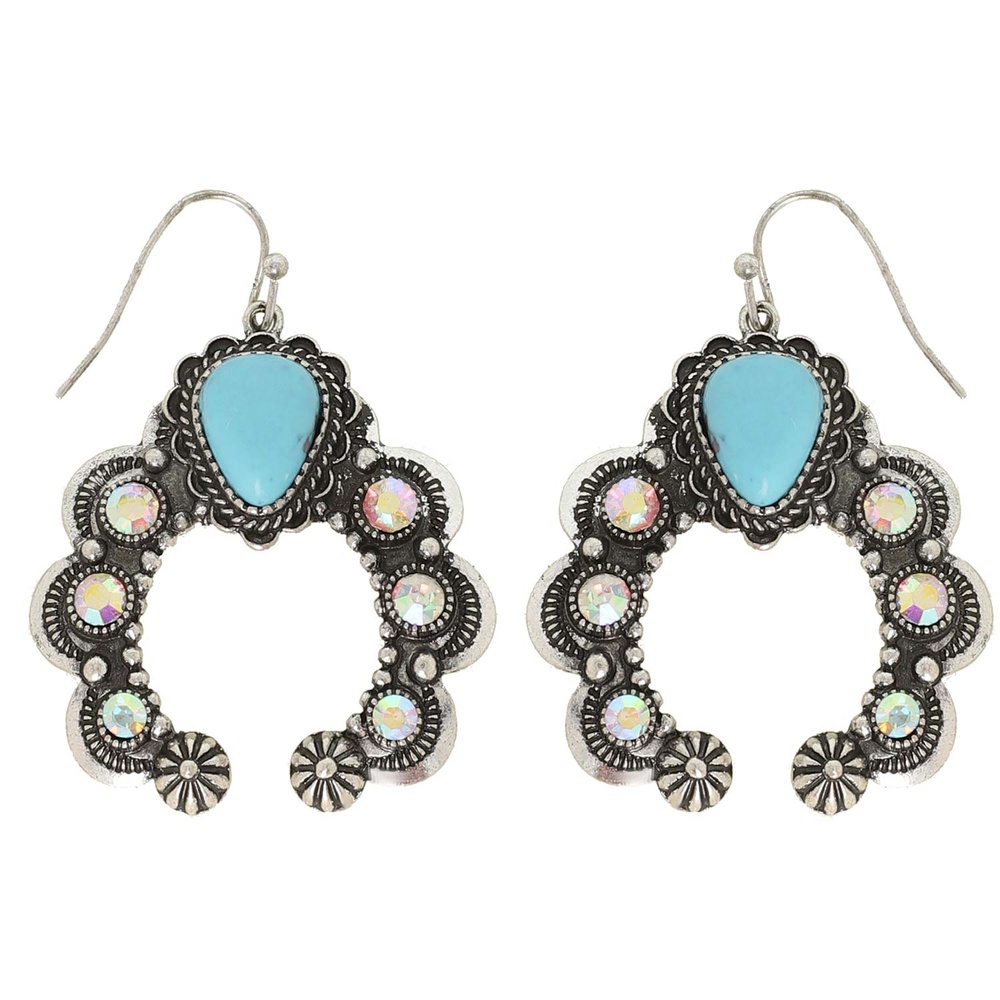 WESTERN SQUASH BLOSSOM AB CRYSTAL GEMSTONE TURQUOISE FISH HOOK DROP EARRINGS