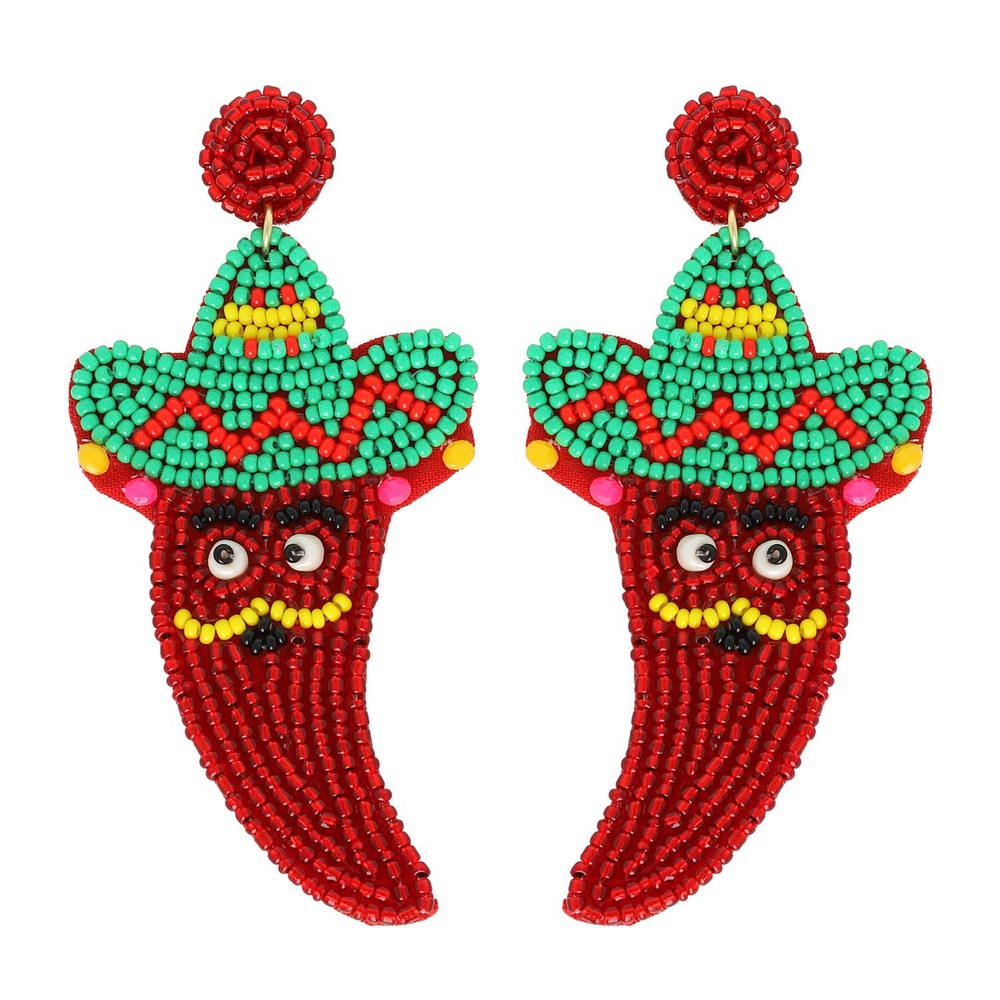 2-TIER SOMBRERO MUSTACHE RED CHILI PEPPER BEADED EMBROIDERY LONG DROP EARRINGS
