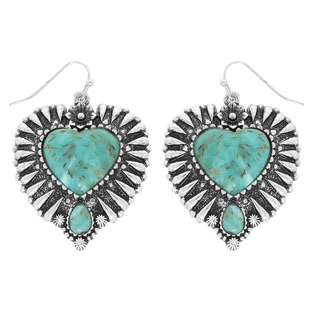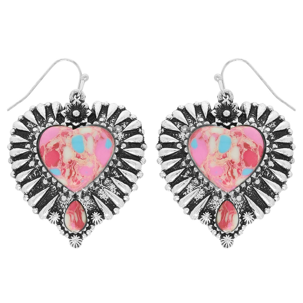 WESTERN HEART SHAPED STONE CONCHO DANGLE EARRINGS WITH SQUASH BLOSSOM ACCENTS